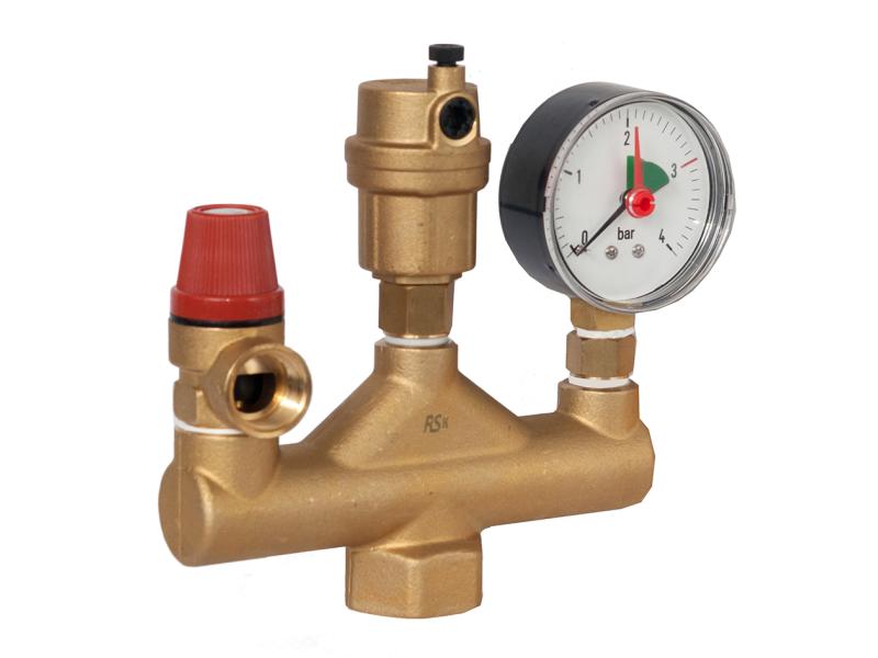 Группа безопасности котла фирмы RSK. Страна-производитель - Италия. В комплект входят: автоматический воздухоотводчик, предохранительный клапан, манометр. Такой прибор устанавливается на напольных котлах для контроля за давлением в системе и для сброса лишнего воздуха. Воздухоотводчик сбрасывает лишний воздух в автоматическом режиме. Предохранительный клапан сливает воду, если давление превышает 3 Бар. К монтажу групп безопасности применяются те же требования, что и к монтажу предохранительных клапанов. Группа безопасности монтируется выше котла, в вертикальном положении на выходе из котла на трубопроводе подачи в систему. Характеристики: Диаметр соединения с резьбой для подключения к тепловому агрегату - 1" Подключение - нижнее Максимальное давление манометра - 4 Бар Максимальное давление предохранительного клапана - 3 Бар Максимальная рабочая температура - 110 Материал предохранительного клапана – латунь Материал воздухоотводчика –латунь Материал корпуса – латунь Манометр –сталь Количество в упаковке -20