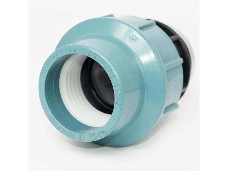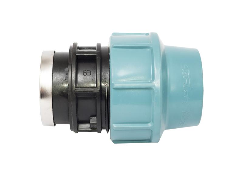 Муфта для полиэтиленовых труб внутренняя резьба 2", диаметр Ø63. Компрессионные фитинги применяются для создания наружных водопроводов, поливочных систем и используются преимущественно для транспортировки холодной воды. Достоинства: доступность по цене, небольшой вес, быстрый и легкий монтаж, не требующий дополнительных инструментов, возможность создания разъемных соединений. Номинальная температура для применения – 20˚С, а максимальная рабочая температура – до 60˚С в пределах рабочего диапазона труб. Номинальное давление зависит от диаметра: для 16, 20, 25, 32, 40, 50, 63 мм оно составляет 16 бар, для фитингов 75, 90 и 110 – 12,5 бар соответственно. Компрессионные фитинги производятся в соответствии со стандартами UNI, ISO, DIN, NF, резьбы в соответствии со UNI, а фланцевые соединения соответствуют требованиям UNI и DIN. Все фитинги выполнены в соответствии с общими техническими условиями. Для изготовления фитингов используется черный полипропилен для корпуса, черная прокладка из нитриловой резины, белое зажимное кольцо из полиацетата и гайка из полипропилена.