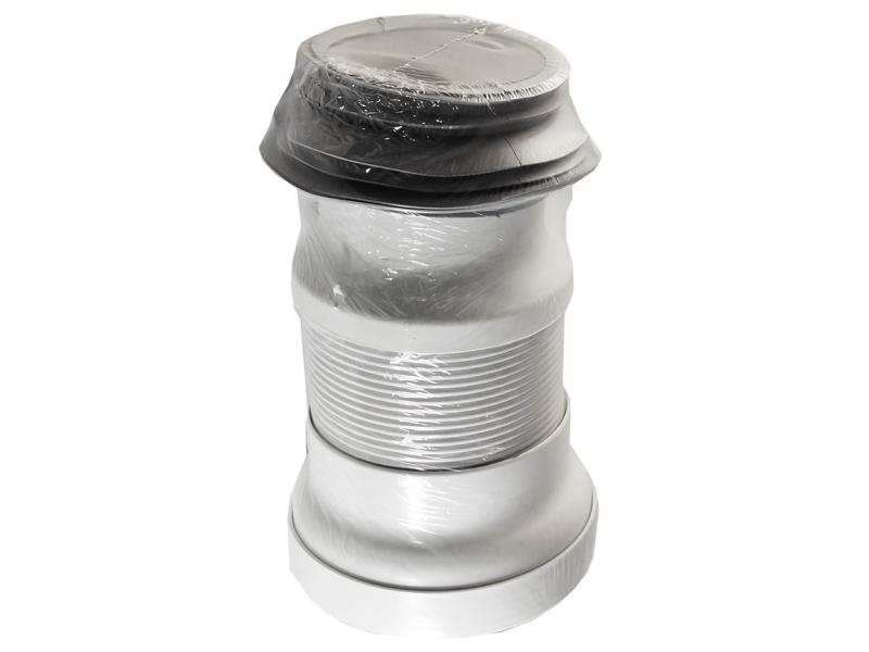 Белая гибкая гофра (манжет) для унитаза украинского производства. Класс продукции – эконом. При помощи гофры можно подключить унитаз к канализационной сети. Прямое назначение гофры – это отвод сточных вод от унитаза в канализационный стояк. В настоящее время гофры на унитаз изготавливают в основном из таких материалов, как пластик и резина. При покупке гофры необходимо обращать внимание на ее соответствие требуемым параметрам - она должна подходить по длине, типу уплотнения и диаметру посадочного отверстия. Гофру на унитаз благодаря ее конструктивным особенностям можно изогнуть и вытянуть на значительную длину, что позволяет подобрать для унитаза наиболее удачное расположение в помещении. Гофра на унитаз заменит канализационную трубу, одним концом ее можно легко соединить с унитазом, а другой конец гофры можно поместить в приемный раструб тройника или крестовины. Необходимо проследить за тем, чтобы при подключении унитаза посредством гофры был соблюден требуемый по нормативам уклон.