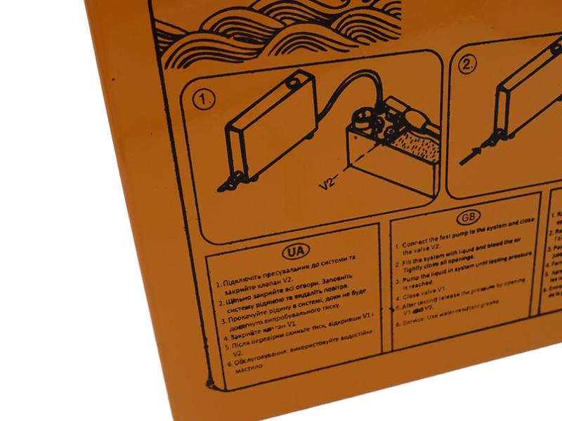 Модель 12-ти литровая предназначена для испытания трубопровода на утечку. Это простой в использование опрессовочный инструмент с ручным управлением, а так же удобными вентилями, при помощи которых производится регулировка мощности, глицериновым манометром и шлангом высокого давления с резьбовым соединением. Максимальное давление, накачиваемое данным ручным насосом, составляет не более 50 Атм. В качестве испытательного давления - это предел, так как рабочее, как правило, составляет не более 20 Атм. Среда работы данного опрессовочного устройства - воздух, вода, масло, нефть. Опрессовщик для этих целей имеет встроенный бак на 12 литров. Опрессовщик позволяет измерить давление в емкостях, наполненных водой, маслами, газом, сжатым воздухом. Корпус изделия имеет повышенную долговечность благодаря нанесенному антикоррозийному составу. Максимальное давление 50 бар, 40 мл\такт. Объем резервуара составляет 12 л.