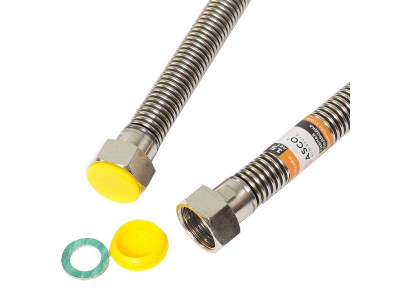 Гофрированный шланг сильфонного типа для газа, изготовленный из высококачественных материалов, которые обеспечивают длительную эксплуатацию. Основное предназначение – подключение газовых плит и колонок. Вся гибкая подводка для газа сертифицирована, имеет необходимую документацию по охране труда и пожарной безопасности. Они целиком сделаны из нержавеющей стали, а тело трубки - ребристая гофра. Продаются упакованными в полиэтилен, с картонным держателем. • Основные характеристики: • Производитель: ASCO, Турция • Материал шланга: нержавеющая сталь • Длина: 2 м • Радиус изгиба: 20 мм • Внутренняя резьба: 3/4" • Рабочее давление: 0,5 бар • Минимальная температура рабочей жидкости: -15.0 (град.) • Максимальная температура рабочей жидкости: 80.0 (град.) • Соединение: внутреннее-внутреннее (ВВ). Бренд ASCO имеет все необходимые сертификаты качества (система контроля качества ISO 9001-2000). Они лучше всего выдерживают давление газового потока.
