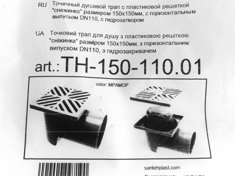 Горизонтальный пластиковый душевой трап торговой марки Santehplast (Сантехпласт) с гидрозатвором серого цвета. Размер решетки - 15х15 см. Узор решетки - снежинка. Диаметр выпуска - DN110. Производство – Харьков, Украина.