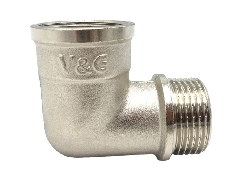 Латунные резьбовые фитинги V&G (никелированные, хромированные) применяются для монтажа трубопроводных систем (водопроводных, хозяйственно-питьевых, отопительных) для транспортировки любых сред, не агрессивных к материалам изделия. ТЕХНИЧЕСКИЕ ХАРАКТЕРИСТИКИ: давление рабочее 2,5 МПа (25 бар) (для размеров от 1/2" до 1", кроме VG-204301, VG-204302); 1,6 МПа (25 бар) (для размеров от 1 1/4" до 2"). Рабочая температура: от -20 до +200 °С (для изделий без уплотнения); от -20 до +130 °С (для изделий с уплотнением EPDM). Материал корпуса: латунь CW617N (ЛС 59-2). Угольник дюймовый никелированный внутренняя - наружная резьба применяется там, где необходимо создать поворот в трубопроводе под определенным углом. Другие названия этого фитинга: резьбовое колено, угол латунный.