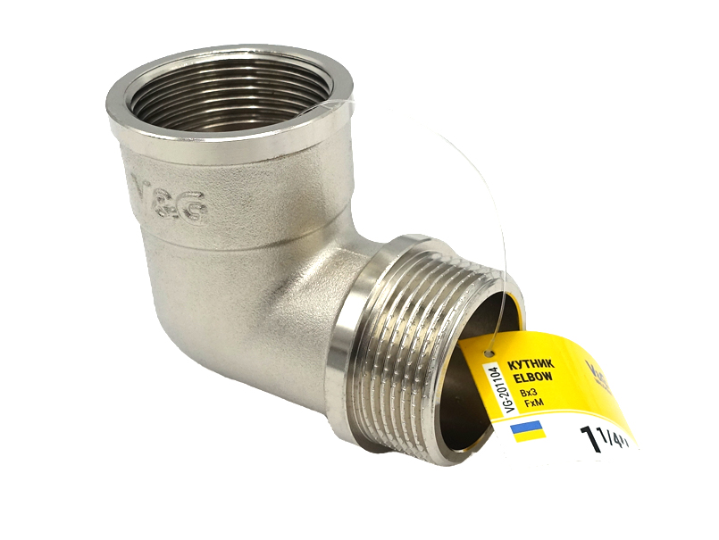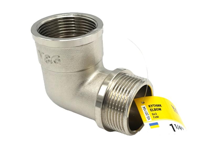 Латунные резьбовые фитинги V&G (никелированные, хромированные) применяются для монтажа трубопроводных систем (водопроводных, хозяйственно-питьевых, отопительных) для транспортировки любых сред, не агрессивных к материалам изделия. ТЕХНИЧЕСКИЕ ХАРАКТЕРИСТИКИ: давление рабочее 2,5 МПа (25 бар) (для размеров от 1/2" до 1", кроме VG-204301, VG-204302); 1,6 МПа (25 бар) (для размеров от 1 1/4" до 2"). Рабочая температура: от -20 до +200 °С (для изделий без уплотнения); от -20 до +130 °С (для изделий с уплотнением EPDM). Материал корпуса: латунь CW617N (ЛС 59-2). Угольник дюйм с четвертью никелированный внутренняя - наружная резьба применяется там, где необходимо создать поворот в трубопроводе под определенным углом. Другие названия этого фитинга: резьбовое колено, угол латунный.