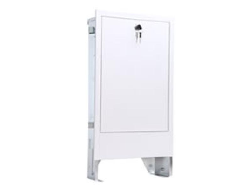 Металлический коллекторный ящик белого цвета. Есть модели встроенные, а также наружные. Позволяют эстетично спрятать в интерьере коллекторные узлы. Встраиваемые и пристенные коллекторные шкафы служат для монтажа блоков в системах отопления и горячего водоснабжения, в том числе и типа "теплый пол". Чаще всего внутри его устанавливается коллекторный узел с циркуляционным насосом. Также используется еще и как маскировка - в него прячут детали, портящие дизайн помещения, а также уберегают гребенки от доступа к ним детей и домашних животных. Обычно на практике распределительные короба делают белыми. Материал: оцинкованная сталь. Окрашивание производится порошковым красителем-эмалью после фосфатной очистки стали. Цвет по RAL 9016. У встроенных моделей боковые стенки не окрашены, и имеют отверстия, а также ножки. Наружные - похожи на часть интерьера. Независимо от подтипа, все ящики оборудованы дверцей, закрывающейся на ключ (идут в комплекте поставки). Высота ящика 600 мм, с ножками 700 мм. Высота ящика 600 мм, с ножками 700 мм. Глубина ящика: 120 мм.