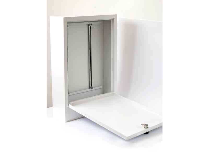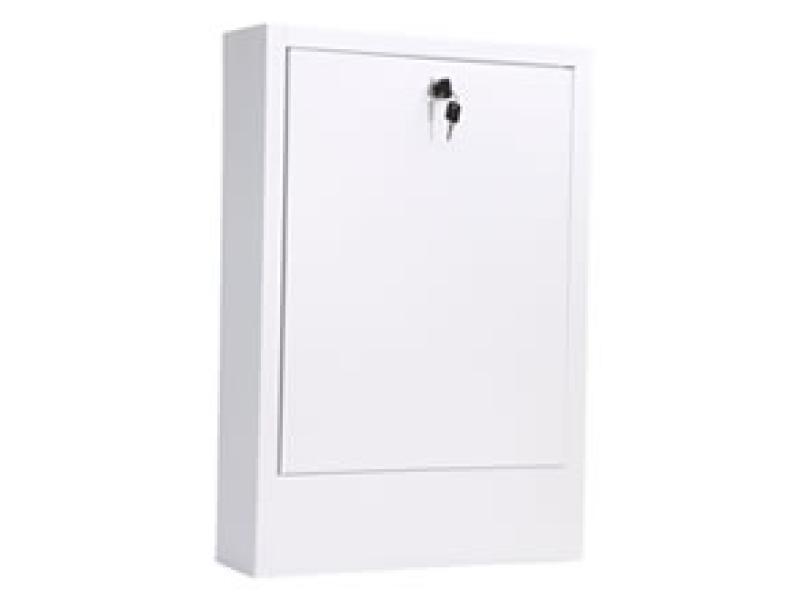 Металлический коллекторный ящик белого цвета. Есть модели встроенные, а также наружные. Позволяют эстетично спрятать в интерьере коллекторные узлы. Встраиваемые и пристенные коллекторные шкафы служат для монтажа блоков в системах отопления и горячего водоснабжения, в том числе и типа "теплый пол". Чаще всего внутри его устанавливается коллекторный узел с циркуляционным насосом. Также используется еще и как маскировка - в него прячут детали, портящие дизайн помещения, а также уберегают гребенки от доступа к ним детей и домашних животных. Обычно на практике распределительные короба делают белыми. Материал: оцинкованная сталь. Окрашивание производится порошковым красителем-эмалью после фосфатной очистки стали. Цвет по RAL 9016. У встроенных моделей боковые стенки не окрашены, и имеют отверстия, а также ножки. Наружные - похожи на часть интерьера. Независимо от подтипа, все ящики оборудованы дверцей, закрывающейся на ключ (идут в комплекте поставки). Глубина ящика: 120 мм.