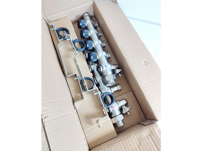 Коллекторная группа из нержавеющей стали предназначена для установки в системах отопления с поддержанием постоянной циркуляциии. Подключение трубопровода, подводящего к коллекторной группе, возможно по выбору с левой или правой стороны. Крепление позволяет установить коллекторную группу в монтажном шкафу или непосредственно на стене. Коллекторная группа может быть снабжена шаровым краном. Подсоединение шарового крана с плоским уплотнением осуществляется непосредственно на накидную гайку (G1 внутренняя резьба) коллекторной группы. Возможна установка стандартных счетчиков тепла G1 и G3/4. За счет этого строительная глубина и ширина коллекторной группы увеличиваются, что следует учитывать при выборе монтажного шкафа. Присоединение падающей и обратной линии: наружная резьба G 3/4 в соответствии с DIN EN 16313 (евроконус). Для обозначения прямой и обратной линии прилагаются специальные наклейки.