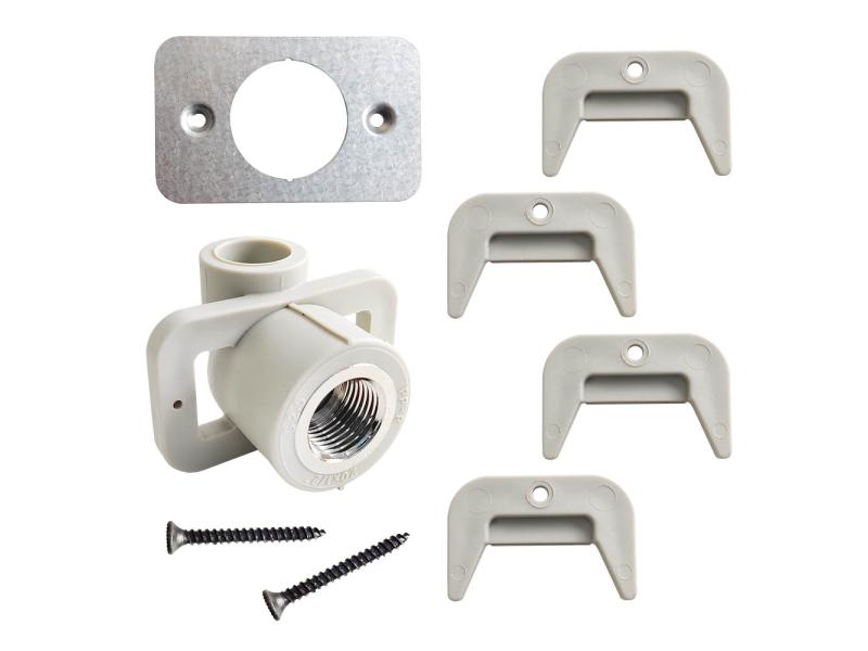 Полипропиленовый комбинированный монтажный угол под гипсокартон TEBO идеально подходит для фиксации трубопровода из пластика и закрепления выпускной арматуры (смесители, краны) на гипсокартонной стене. Пластиковые ушки и фиксирующая металлическая пластина позволяют жестко закреплять переход на гипсокартон. В комплекте поставляются 4 п-образные пластиковые подложки, позволяющие регулировать выступ фитинга из стены в зависимости от толщины гипсокартона. Используется трубами с напорным рядом PN10, PN16, PN20. Угольник подходит для установки смесителей, выпускных арматур, в том числе латунных клапанов, кранов, душевых сеток и т.д. Уголки упакованы в индивидуальную полиэтиленовую упаковку с маркировкой в виде наклейки.