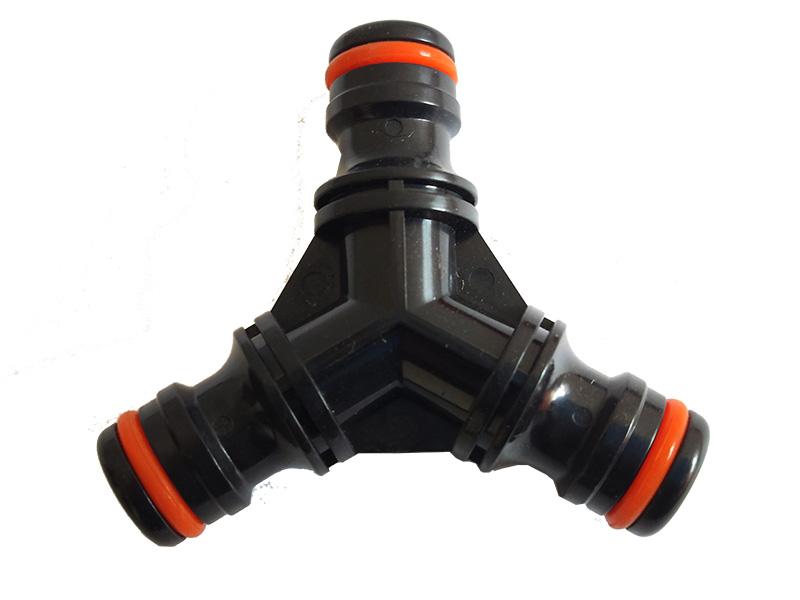 Тройник для коннектора производства Украина, эконом-класс, предназначен для соединения трёх отрезков шлангов одинаковых или разных диаметров через быстросъёмный коннектор.
