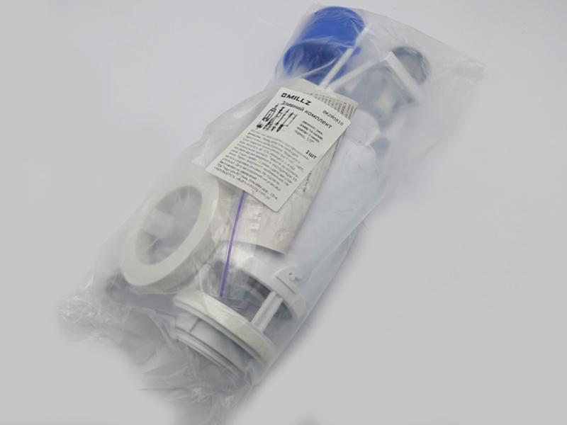 Набор для бачка унитаза MILLZ BK2R0810 состоит из сливного механизма с двойным режимом слива и хромированной кнопкой и наливного клапана с нижней подводкой пластиковым штуцером с резьбой диаметром 1/2». Комплектуется двумя кольцами из эластичного вспененного ППУ, а также конусной и плоской шайбами из эластичного высококачественного PVC, обеспечивающими надежную герметизацию при установке клапана и механизма в бачке унитаза. Так же в комплект входит набор крепления бачка к унитазу с винтами, гайками и шайбам из нержавеющей стали. Область применения для подключения унитазного бачка с нижней подводкой к сети водоснабжения для автоматического наполнения унитазного бачка водой для слива воды из бачка унитаза для бачка унитаза со сливным отверстием Ø60-70 мм Технические характеристики присоединительный размер к сети водоснабжения G1/2» диапазон рабочих давлений 0,05-1,0 Мпа время заполнения бачка в объеме 6,0 л не более 150 секунд стабильность уровня наполнения унитазного бачка водой не более +/-2 мм уровень шума при работе не более 50 дБА установленный ресурс не менее 150000 циклов высота комплектного бачка с крышкой 330-400 мм диаметр присоединительного отверстия в бачке унитаза 60-70 мм количество режимов слива - 2 объем сливаемой воды в первом (экономном) режиме - 3 л средний расход воды, которая подается из бачка на смыв через арматуру не менее 2,5 л/сек усилие нажатия кнопки для запуска слива воды не более 20Н длина нержавеющих винтов крепления бачка к унитазу 82 мм Свойства комплектуется уплотнительными конусной и плоской шайбами для герметизации соединения наливного клапана с бачком унитаза конусная и плоская шайбы изготовлены из эластичного высококачественного PVC комплектуется двумя кольцами из эластичного вспененного ППУ, обеспечивающими надежную герметизацию при установке сливного механизма в бачок унитаза, а так же при установке бачка унитаза на полочку унитаза штуцер резьбовой из высококачественного пластика в комплект входит набор крепления бачка к унитазу винты, гайки и шайбы для крепления бачка к унитазу изготовлены из нержавеющей стали кнопка и декоративное кольцо кнопки пластмассовые с хромированным покрытием рабочий диапазон температур от 0 до +95° C