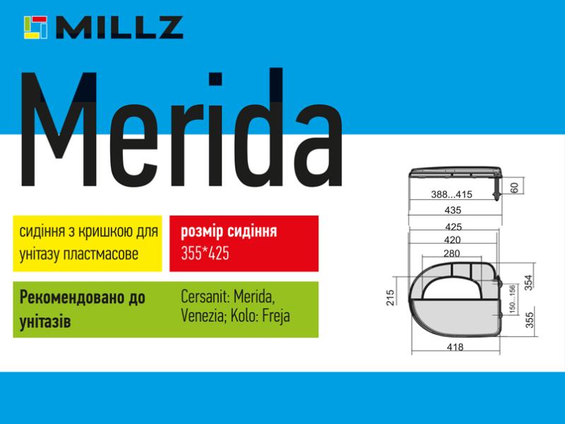 MILLZ - качественные сиденья и крепления для унитазов. Сиденья (крышки) для унитаза изготовлены из качественного безопасного материала - полипропилена. Каждая крышка разработана под определенную модель унитаза, представленную на рынке. Аналогично отдельно продается и крепления к этому типу унитаза. Крышки поставляется в полиэтиленовом пакете с вкладышем. Каждый товар простикерован наклейкой, которая содержит информацию о названии и артикул товара. Девиз бренда MILLZ - качество и приятная цена для украинских потребителей. Размер сиденья: 355*425 Рекомендовано к унитазам: Cersanit: Merida, Venezia; Kolo: Freja.