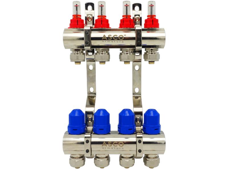 Коллекторная группа со встроенными расходомерами бренда ASCO со стойким никелевым глянцевым покрытием. Количество выходов: от 2 до 12 . С евроконусами. Диаметр выходов 1" х 16. Материал: латунь CW617N, покрытие - никель. Крепления в комплекте. Упаковка - картон с ложементом, благодаря чему коллектор не деформируется при транспортировке. Коллекторная группа ASCO с расходомерами используется в системах отопления и горячего водоснабжения, позволяя создать и обеспечить надежную стабильную работу системы теплого пола. Она дает возможность значительно упростить систему, исключив из нее дополнительную арматуру. Расходомеры позволяют снизить температуру пола в отдельных помещениях, где, например, на данный момент никто не живет. В целом коллекторная группа в сборе ASCO предназначена для выполнения своей главной функции – обеспечения равномерного давления и поступления воды для всех приборов и контуров в системе. Комплект поставки коллекторной группы для теплого пола включает подающий коллектор с расходомерами, обратный коллектор и крепежи. Габариты коробки, см: 32 х 37 х 5,5