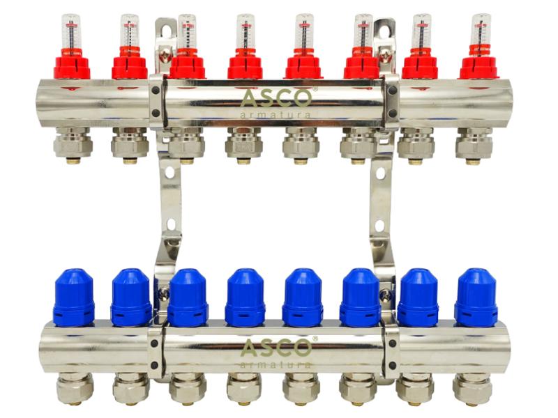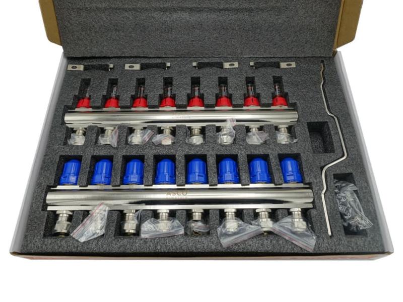 Коллекторная группа со встроенными расходомерами бренда ASCO со стойким никелевым глянцевым покрытием. Количество выходов: от 2 до 12 . С евроконусами. Диаметр выходов 1" х 16. Материал: латунь CW617N, покрытие - никель. Крепления в комплекте. Упаковка - картон с ложементом, благодаря чему коллектор не деформируется при транспортировке. Коллекторная группа ASCO с расходомерами используется в системах отопления и горячего водоснабжения, позволяя создать и обеспечить надежную стабильную работу системы теплого пола. Она дает возможность значительно упростить систему, исключив из нее дополнительную арматуру. Расходомеры позволяют снизить температуру пола в отдельных помещениях, где, например, на данный момент никто не живет. В целом коллекторная группа в сборе ASCO предназначена для выполнения своей главной функции – обеспечения равномерного давления и поступления воды для всех приборов и контуров в системе. Комплект поставки коллекторной группы для теплого пола включает подающий коллектор с расходомерами, обратный коллектор и крепежи. Габариты коробки, см: 52 х 37 х 5,5