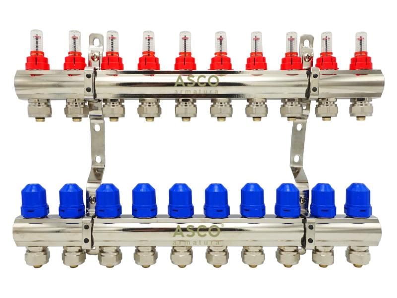 Коллекторная группа со встроенными расходомерами бренда ASCO со стойким никелевым глянцевым покрытием. Количество выходов: от 2 до 12 . С евроконусами. Диаметр выходов 1" х 16. Материал: латунь CW617N, покрытие - никель. Крепления в комплекте. Упаковка - картон с ложементом, благодаря чему коллектор не деформируется при транспортировке. Коллекторная группа ASCO с расходомерами используется в системах отопления и горячего водоснабжения, позволяя создать и обеспечить надежную стабильную работу системы теплого пола. Она дает возможность значительно упростить систему, исключив из нее дополнительную арматуру. Расходомеры позволяют снизить температуру пола в отдельных помещениях, где, например, на данный момент никто не живет. В целом коллекторная группа в сборе ASCO предназначена для выполнения своей главной функции – обеспечения равномерного давления и поступления воды для всех приборов и контуров в системе. Комплект поставки коллекторной группы для теплого пола включает подающий коллектор с расходомерами, обратный коллектор и крепежи. Габариты коробки, см: 62 х 37 х 5.5