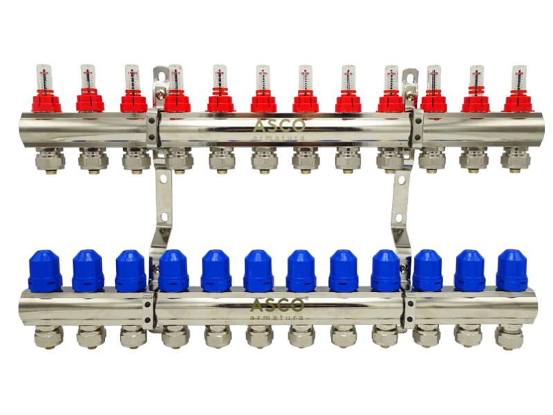 Коллекторная группа со встроенными расходомерами бренда ASCO со стойким никелевым глянцевым покрытием. Количество выходов: от 2 до 12 . С евроконусами. Диаметр выходов 1" х 16. Материал: латунь CW617N, покрытие - никель. Крепления в комплекте. Упаковка - картон с ложементом, благодаря чему коллектор не деформируется при транспортировке. Коллекторная группа ASCO с расходомерами используется в системах отопления и горячего водоснабжения, позволяя создать и обеспечить надежную стабильную работу системы теплого пола. Она дает возможность значительно упростить систему, исключив из нее дополнительную арматуру. Расходомеры позволяют снизить температуру пола в отдельных помещениях, где, например, на данный момент никто не живет. В целом коллекторная группа в сборе ASCO предназначена для выполнения своей главной функции – обеспечения равномерного давления и поступления воды для всех приборов и контуров в системе. Комплект поставки коллекторной группы для теплого пола включает подающий коллектор с расходомерами, обратный коллектор и крепежи. Габариты коробки, см: 72 х 37 х 5,5