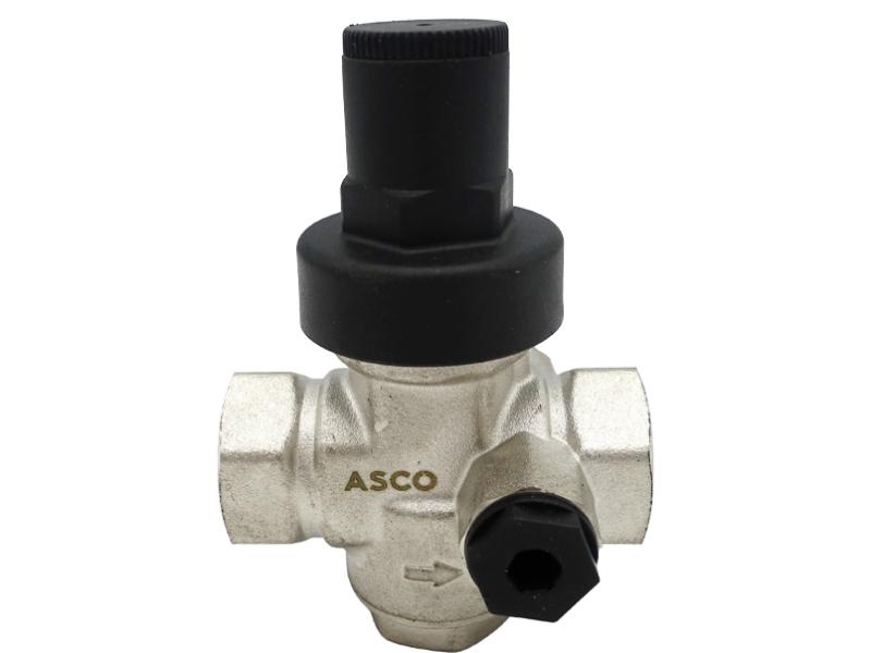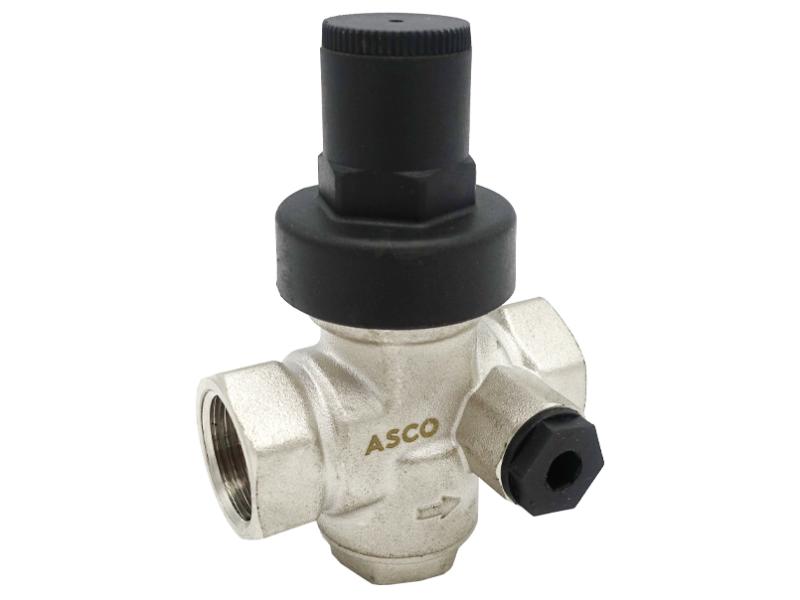 Редуктор давления ASCO – предназначен для поддержания постоянного давления настройки на выходе в динамическом и статическом режимах независимо от скачков давления на входе в редуктор. Редуктор применяется в сетях холодного, горячего, бытового и промышленного водоснабжения, а также других жидкостей и газов, не агрессивных материалу редуктора. Технические характеристики Макс. делают давление на входе: 16 бар Макс. раб. давление на выходе: 4,5 бар Пределы регулировки: 1 - 5.5 бар Заводская настройка: 3 бар Точность: 0,2 бар Размер выхода под манометр: ¼ дюйма Макс. темп. раб. среды: 130 градусов Пропускная способность при 1,2 бар, 35 л/мин Уровень шума до 18 дБ.