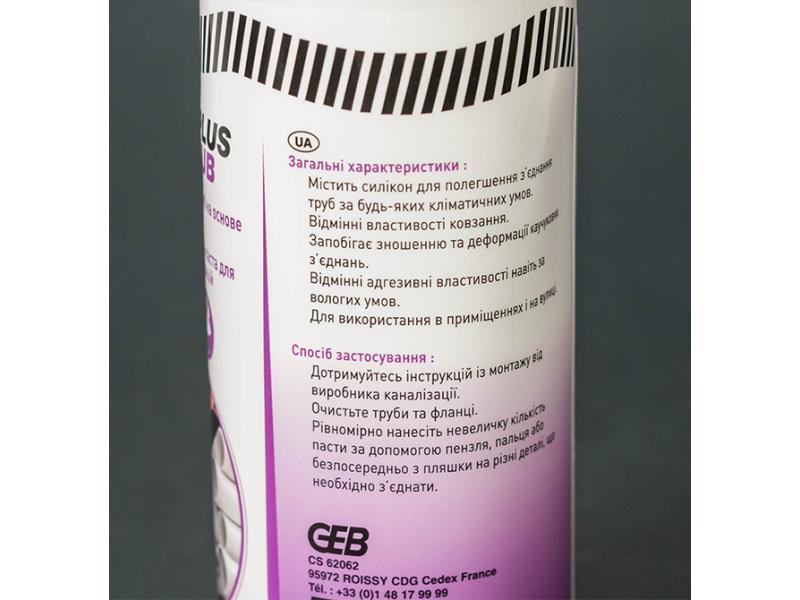 Змащувач для труб GEBEX PLUS на силіконовій основі від виробника GEB призначений для змащення різних типів труб та захисту герметизаційних манжет у будь-яких умовах. Підходить для різних видів труб, таких як пластикові, чавунні, бетонні та інші, і також для захисту гумових з'єднань. Застосовується для систем нагнітального і відкачувального типу. Даний продукт не розчиняється у воді та може бути використаний для труб будь-якого діаметра. Змащувач для труб забезпечує відмінне ковзання та запобігає зносу і деформації гумових сполучень. Має нейтральний pH (6,0-6,8) при 20 °C. Температура застосування: від -15 до +40 °C. Паста білого кольору. Поставляється в пластиковій пляшці 400 г. Інструкція нанесена на тару. Торгова марка GEB Франція - один з основних виробників клею для ПВХ, анаеробної смоли та пасти для швів, а також один із головних європейських гравців у виробництві вогнетривких клеїв та герметиків. GEB славиться своєю надійністю, автентичністю, серйозністю і високим ступенем професіоналізму виробника. Починаючи з 1860 року, GEB виготовляє продукцію, що користується бездоганною репутацією. Компанія представлена приблизно в п’ятдесяти країнах завдяки мережі дистриб'юторів і агентів у Європі, Південній Африці та Близькому Сході.