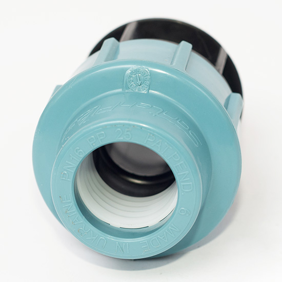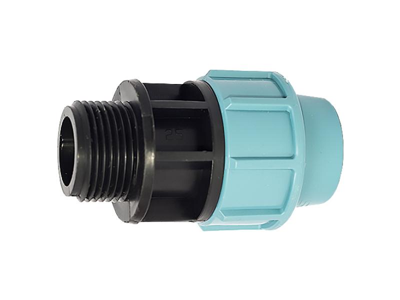 Муфта для поліетиленових труб, зовнішня різьба 1", діаметр 25 мм.Компресійні фітинги застосовуються для створення зовнішніх водопроводів, поливних систем і використовуються переважно для транспортування холодної води. Переваги: доступність за ціною, невелика вага, швидкий і легкий монтаж, що не вимагає додаткових інструментів, можливість створення роз'ємних з'єднань. Номінальна температура для застосування – 20˚С, а максимальна робоча температура – до 60˚С в межах робочого діапазону труб. Номінальний тиск залежить від діаметра: для 16, 20, 25, 32, 40, 50, 63 мм він складає 16 бар, для фітингів 75, 90 і 110 – 12,5 бар відповідно. Компресійні фітинги виробляються за стандартами UNI, ISO, DIN, NF, різьба за стандартами UNI, а фланцеві з'єднання відповідають вимогам UNI і DIN. Всі фітинги виконані за загальними технічними умовами. Для виготовлення фітингів використовується: чорний поліпропілен для корпусу, чорна прокладка з нітрилової гуми, біле затискне кільце з поліацетата і гайка з поліпропілену.