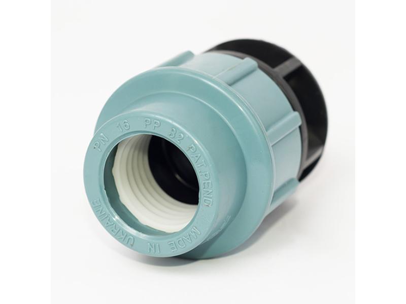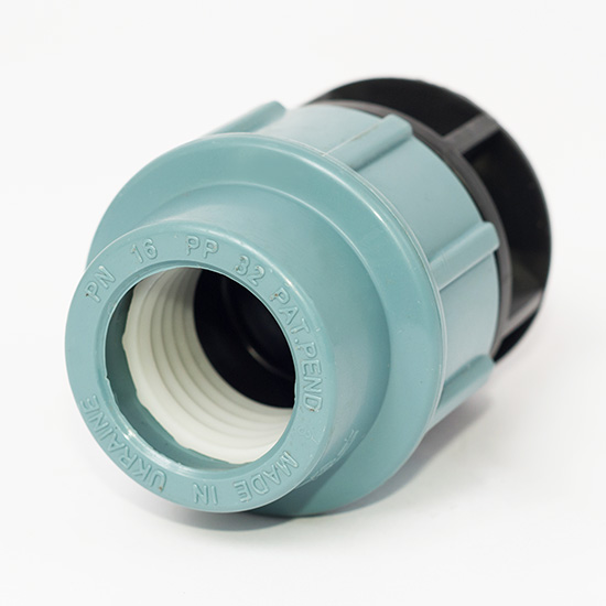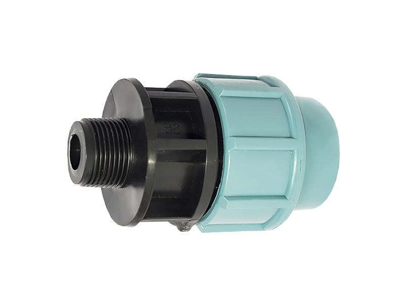 Муфта для поліетиленових труб, зовнішня різьба 3/4", діаметр 32 мм. Компресійні фітинги застосовуються для створення зовнішніх водопроводів, поливних систем і використовуються переважно для транспортування холодної води. Переваги: доступність за ціною, невелика вага, швидкий і легкий монтаж, що не вимагає додаткових інструментів, можливість створення роз'ємних з'єднань. Номінальна температура для застосування – 20˚С, а максимальна робоча температура – до 60˚С в межах робочого діапазону труб. Номінальний тиск залежить від діаметра: для 16, 20, 25, 32, 40, 50, 63 мм він складає 16 бар, для фітингів 75, 90 і 110 – 12,5 бар відповідно. Компресійні фітинги виробляються за стандартами UNI, ISO, DIN, NF, різьба за стандартами UNI, а фланцеві з'єднання відповідають вимогам UNI і DIN. Всі фітинги виконані за загальними технічними умовами. Для виготовлення фітингів використовується: чорний поліпропілен для корпусу, чорна прокладка з нітрилової гуми, біле затискне кільце з поліацетата і гайка з поліпропілену.