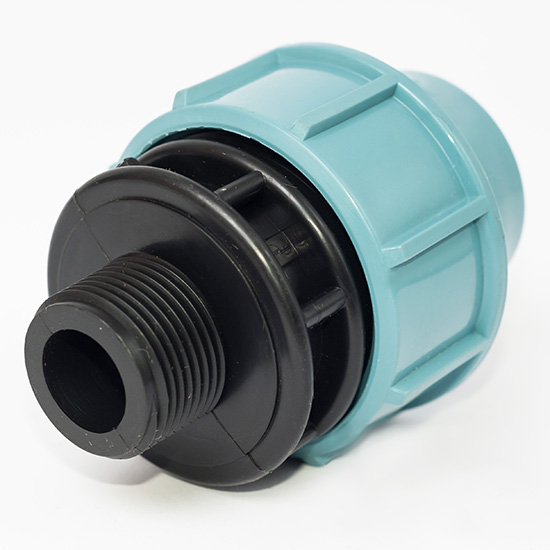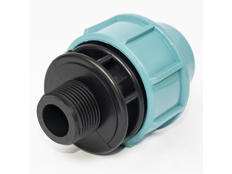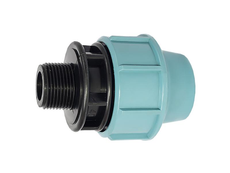 Муфта затискна для поліетиленових труб, зовнішня різьба 1", діаметр 40 мм. Компресійні фітинги застосовуються для створення зовнішніх водопроводів, поливних систем і використовуються переважно для транспортування холодної води. Переваги: доступність за ціною, невелика вага, швидкий і легкий монтаж, що не вимагає додаткових інструментів, можливість створення роз'ємних з'єднань. Номінальна температура для застосування – 20˚С, а максимальна робоча температура – до 60˚С в межах робочого діапазону труб. Номінальний тиск залежить від діаметра: для 16, 20, 25, 32, 40, 50, 63 мм він складає 16 бар, для фітингів 75, 90 і 110 – 12,5 бар відповідно. Компресійні фітинги виробляються за стандартами UNI, ISO, DIN, NF, різьба за стандартами UNI, а фланцеві з'єднання відповідають вимогам UNI і DIN. Всі фітинги виконані за загальними технічними умовами. Для виготовлення фітингів використовується: чорний поліпропілен для корпусу, чорна прокладка з нітрилової гуми, біле затискне кільце з поліацетата і гайка з поліпропілену.