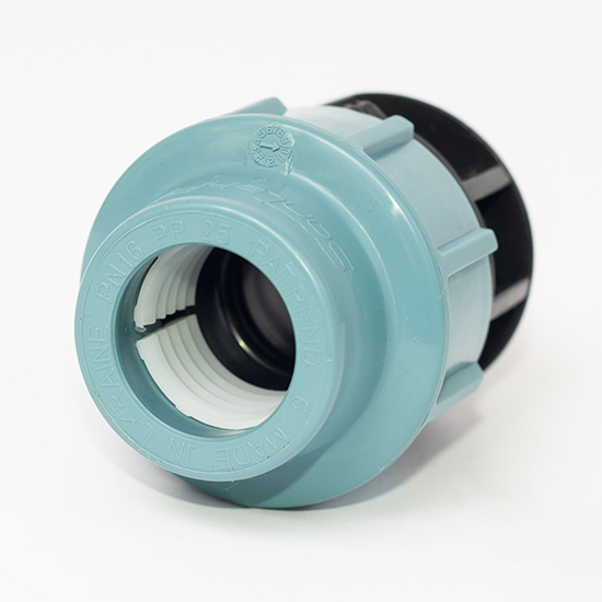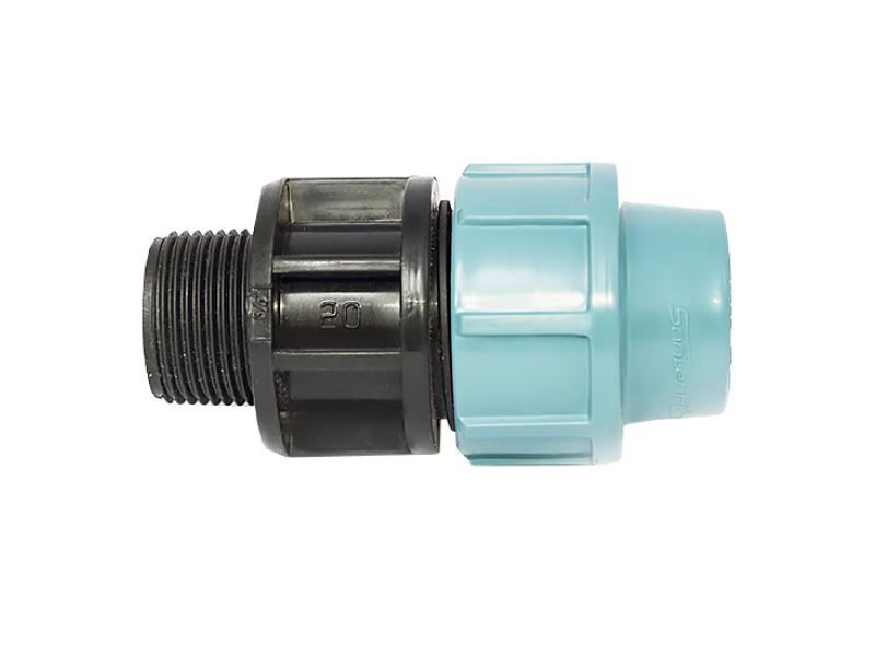 Муфта затискна для поліетиленових труб, зовнішня різьба 3/4", діаметр 25 мм. Компресійні фітинги застосовуються для створення зовнішніх водопроводів, поливних систем і використовуються переважно для транспортування холодної води. Переваги: доступність за ціною, невелика вага, швидкий і легкий монтаж, що не вимагає додаткових інструментів, можливість створення роз'ємних з'єднань. Номінальна температура для застосування 20˚С, а максимальна робоча температура - до 60˚С в межах робочого діапазону труб. Номінальний тиск залежить від діаметра: для 16, 20, 25, 32, 40, 50, 63 мм воно складає 16 бар, для фітингів 75, 90 і 110 - 12,5 бар відповідно. Компресійні фітинги виробляються відповідно до стандартів UNI, ISO, DIN, NF, різьба відповідно до UNI, а фланцеві з'єднання відповідають вимогам UNI і DIN. Всі фітинги виконані відповідно до загальних технічних умов. Для виготовлення фітингів використовується чорний поліпропілен для корпусу, чорна прокладка з нітрилової гуми, біле затискне кільце з поліацетата і гайка з поліпропілену.