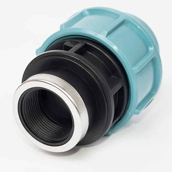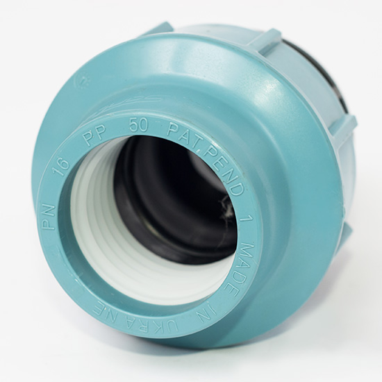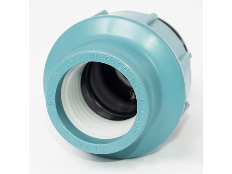 Муфта для поліетиленових труб внутрішня різьба 1 1/4", діаметр Ø50. Компресійні фітинги застосовуються для створення зовнішніх водопроводів, поливних систем і використовуються переважно для транспортування холодної води. Переваги: доступність за ціною, невелика вага, швидкий і легкий монтаж, що не вимагає додаткових інструментів, можливість створення роз'ємних з'єднань. Номінальна температура для застосування 20˚С, а максимальна робоча температура - до 60˚С в межах робочого діапазону труб. Номінальний тиск залежить від діаметра: для 16, 20, 25, 32, 40, 50, 63 мм воно складає 16 бар, для фітингів 75, 90 і 110 - 12,5 бар відповідно. Компресійні фітинги виробляються відповідно до стандартів UNI, ISO, DIN, NF, різьба відповідно до UNI, а фланцеві з'єднання відповідають вимогам UNI і DIN. Всі фітинги виконані відповідно до загальних технічних умов. Для виготовлення фітингів використовується чорний поліпропілен для корпусу, чорна прокладка з нітрилової гуми, біле затискне кільце з поліацетата і гайка з поліпропілену.