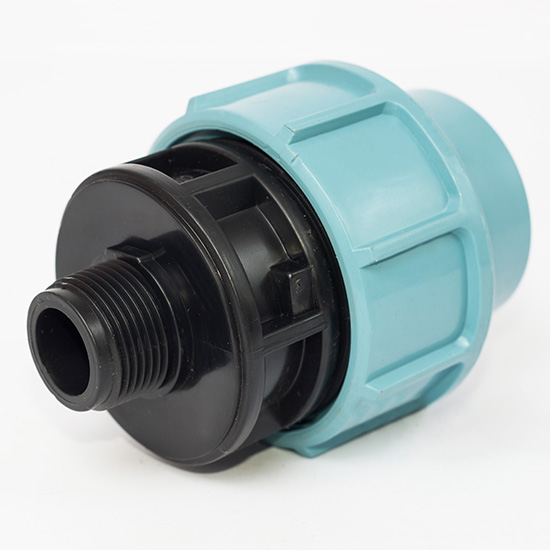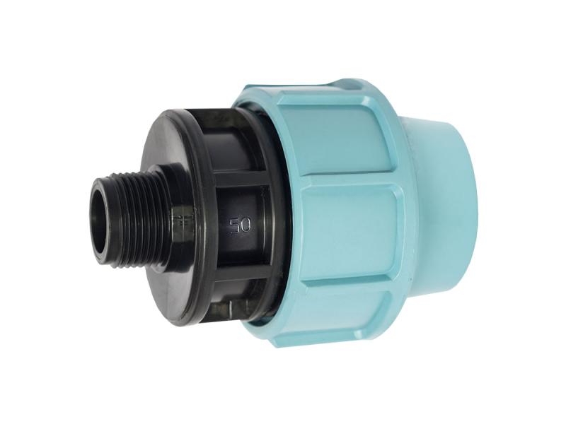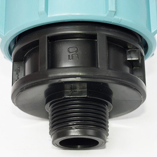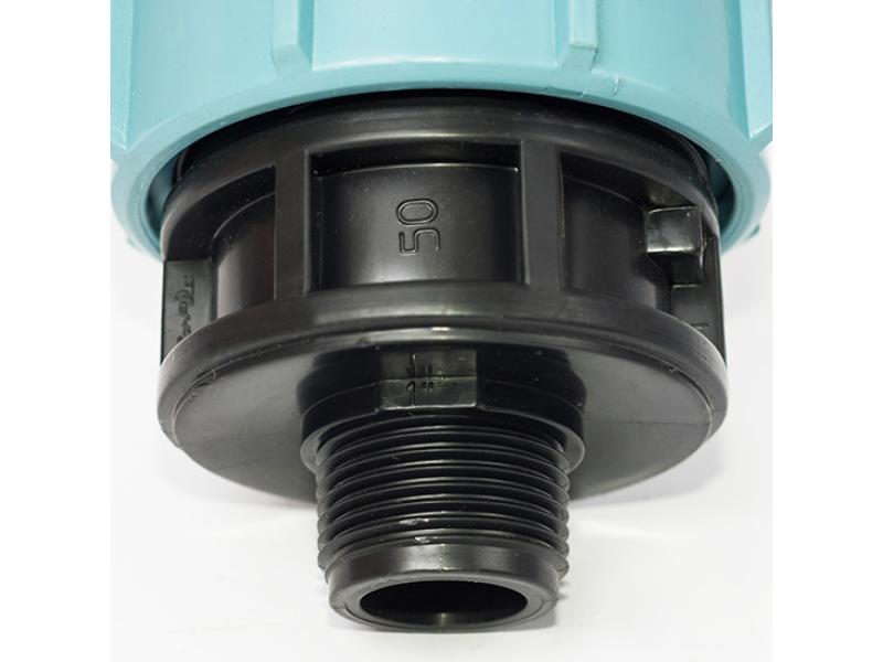 Муфта затискна для поліетиленових труб, зовнішня різьба 1", діаметр 50 мм. Компресійні фітинги застосовуються для створення зовнішніх водопроводів, поливних систем і використовуються переважно для транспортування холодної води. Переваги: доступність за ціною, невелика вага, швидкий і легкий монтаж, що не вимагає додаткових інструментів, можливість створення роз'ємних з'єднань. Номінальна температура для застосування 20˚С, а максимальна робоча температура - до 60˚С в межах робочого діапазону труб. Номінальний тиск залежить від діаметра: для 16, 20, 25, 32, 40, 50, 63 мм воно складає 16 бар, для фітингів 75, 90 і 110 - 12,5 бар відповідно. Компресійні фітинги виробляються відповідно до стандартів UNI, ISO, DIN, NF, різьба відповідно до UNI, а фланцеві з'єднання відповідають вимогам UNI і DIN. Всі фітинги виконані відповідно до загальних технічних умов. Для виготовлення фітингів використовується чорний поліпропілен для корпусу, чорна прокладка з нітрилової гуми, біле затискне кільце з поліацетата і гайка з поліпропілену.