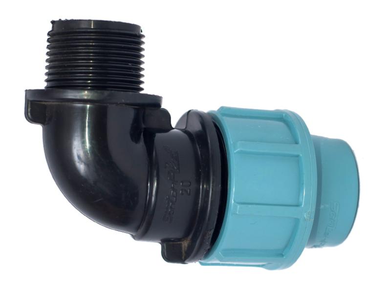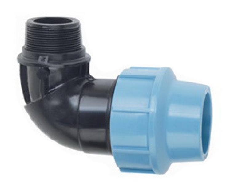 Коліно для поліетиленових труб, зовнішня різьба, діаметр Ø32 х 3/4". Компресійні фітинги застосовуються для створення зовнішніх водопроводів, поливних систем і використовуються переважно для транспортування холодної води. Переваги: доступність за ціною, невелика вага, швидкий і легкий монтаж, що не вимагає додаткових інструментів, можливість створення роз'ємних з'єднань. Номінальна температура для застосування – 20˚С, а максимальна робоча температура – до 60˚С в межах робочого діапазону труб. Номінальний тиск залежить від діаметра: для 16, 20, 25, 32, 40, 50, 63 мм він складає 16 бар, для фітингів 75, 90 і 110 – 12,5 бар відповідно. Компресійні фітинги виробляються за стандартами UNI, ISO, DIN, NF, різьба за стандартами UNI, а фланцеві з'єднання відповідають вимогам UNI і DIN. Всі фітинги виконані за загальними технічними умовами. Для виготовлення фітингів використовується: чорний поліпропілен для корпусу, чорна прокладка з нітрилової гуми, біле затискне кільце з поліацетата і гайка з поліпропілену.