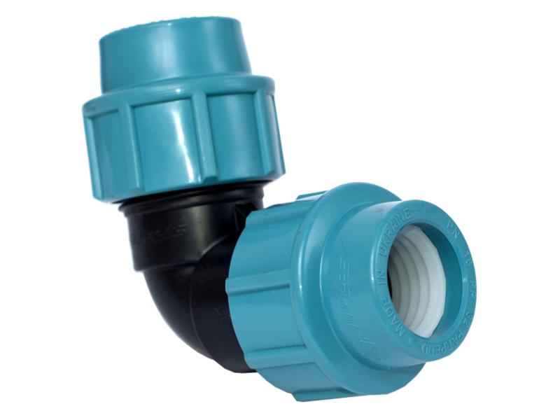 Коліно затискне для поліетиленових труб, діаметр Ø40. Компресійні фітинги застосовуються для створення зовнішніх водопроводів, поливних систем і використовуються переважно для транспортування холодної води. Переваги: доступність за ціною, невелика вага, швидкий і легкий монтаж, що не вимагає додаткових інструментів, можливість створення роз'ємних з'єднань. Номінальна температура для застосування – 20˚С, а максимальна робоча температура – до 60˚С в межах робочого діапазону труб. Номінальний тиск залежить від діаметра: для 16, 20, 25, 32, 40, 50, 63 мм він складає 16 бар, для фітингів 75, 90 і 110 – 12,5 бар відповідно. Компресійні фітинги виробляються за стандартами UNI, ISO, DIN, NF, різьба за стандартами UNI, а фланцеві з'єднання відповідають вимогам UNI і DIN. Всі фітинги виконані за загальними технічними умовами. Для виготовлення фітингів використовується: чорний поліпропілен для корпусу, чорна прокладка з нітрилової гуми, біле затискне кільце з поліацетата і гайка з поліпропілену.