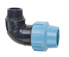 Коліно для поліетиленових труб, зовнішня різьба Ø20 х 1/2". Компресійні фітинги застосовуються для створення зовнішніх водопроводів, поливних систем і використовуються переважно для транспортування холодної води. Переваги: доступність за ціною, невелика вага, швидкий і легкий монтаж, що не вимагає додаткових інструментів, можливість створення роз'ємних з'єднань. Номінальна температура для застосування 20˚С, а максимальна робоча температура - до 60˚С в межах робочого діапазону труб. Номінальний тиск залежить від діаметра: для 16, 20, 25, 32, 40, 50, 63 мм воно складає 16 бар, для фітингів 75, 90 і 110 - 12,5 бар відповідно. Компресійні фітинги виробляються відповідно до стандартів UNI, ISO, DIN, NF, різьба відповідно до UNI, а фланцеві з'єднання відповідають вимогам UNI і DIN. Всі фітинги виконані відповідно до загальних технічних умов. Для виготовлення фітингів використовується чорний поліпропілен для корпусу, чорна прокладка з нітрилової гуми, біле затискне кільце з поліацетата і гайка з поліпропілену.
