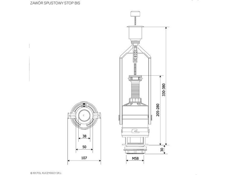 Компанія «KK-POL» (Ка.Ка.Пул, Польща )заснована в 1994 році і з самого початку функціонує як компанія з сімейними традиціями, отримуючи визнання серед лідируючих виробників санітарної кераміки, а так само виробляючи імідж солідного і чесного партнера. Спеціалізацією підприємства є виробництво санітарно-інсталяційних товарів, таких як: наповнюючі клапани (бічні і нижні), зливні клапани (у тому числі з функцією «Стоп» і двофункційні клапани 3-6 л). А також інші санітарно-технічні аксесуари, що виготовляються в різноманітних виконаннях і представляють повний діапазон комплектуючих для туалетних зливних бачків. Відповідає нормам PN-EN 9001-2001 (сертифікація PHIZ) і DIN EN ISO 91001:2001 (сертифікація TUV CERT), і підтверджена в 2003 році видачею відповідних сертифікатів. Характеристики: для компактів заввишки: 330 – 420 мм діаметр: 107 мм мінімальна висота наповнення: 130 мм система змиву: 6 л система СТОП: так кнопка змиву: два варіанти змиву