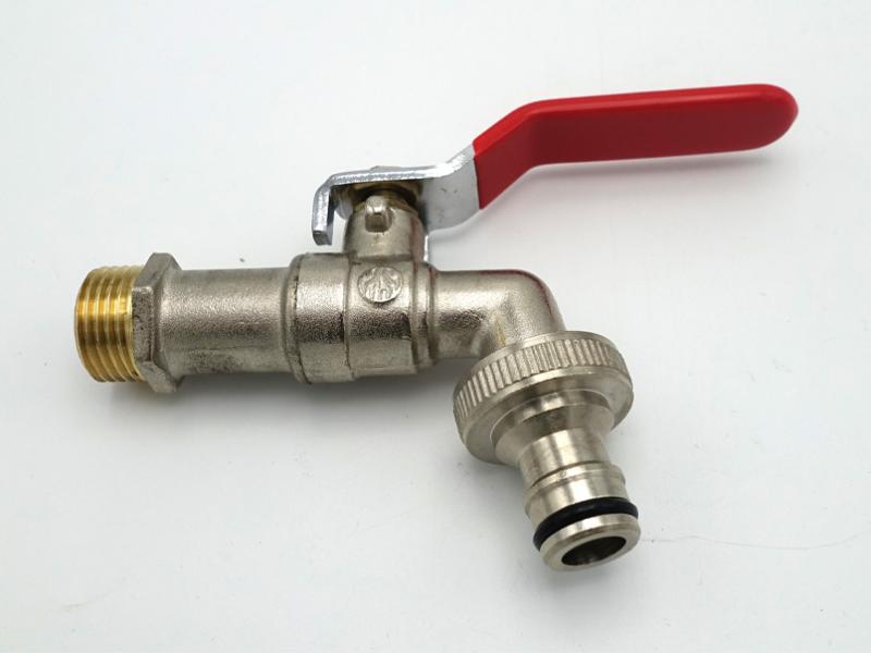 Кран для поливу 1/2" з проточкою ASCO. Латунний нікельований кран, що застосовується у якості запірної арматури на трубопроводах систем водопостачання (у тому числі питного) з робочою температурою до 75 º С і тиском до 10 бар. Наявність знімного штуцера з накидною гайкою дає можливість виробляти його заміну в залежності від діаметра і матеріалу застосовуваного шланга. Розсікач забезпечує формування компактного струменя виливу. Кран оснащений алюмінієвим держаком. Різьба приєднання - зовнішня. Не підлягає ремонту. Мінімальний ресурс - 4 тис. циклів. Крани для поливу мають ще дві назви: кран зі штуцером і кран-пиво. Перша назва обумовлена наявністю виходу типу "йорж", друге, тому що кран врізається в місткість з водою. Відрізняються крани видом покриття (є нікель чи ні) і типом латуні (марка CW617N).