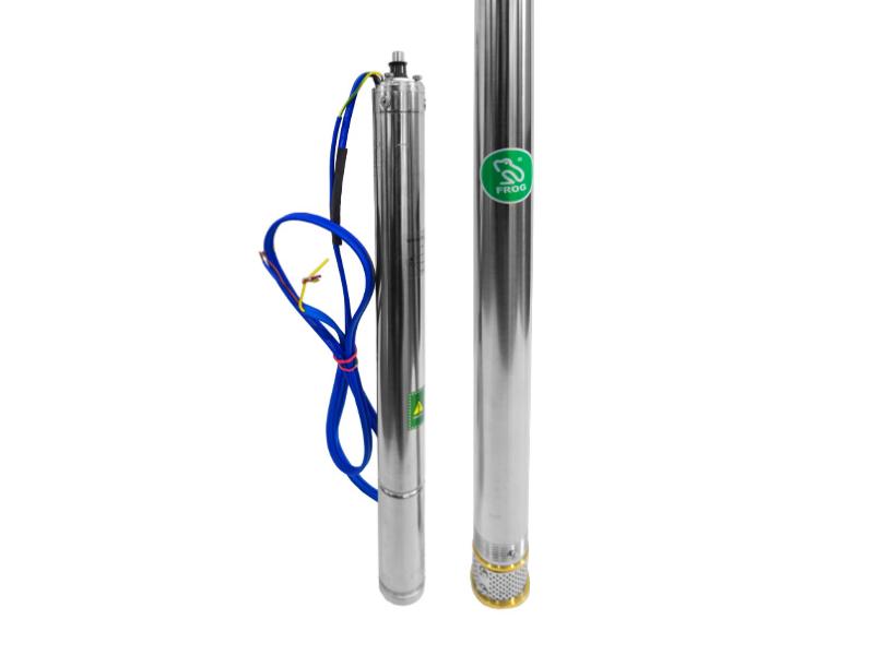 Свердловинний відцентровий насос FROG. Сфера застосування: подача води з колодязя або резервуара, подача води для сільськогосподарських цілей, промислове охолодження та переробка, розподіл води та підвищення тиску тощо. ТЕХНІЧНІ ДАНІ: • Максимальна температура води: 35˚С • Максимально дозволений вміст піску: 300 г/м3 • Маслонаповнений двигун з мідною обмоткою • Максимальна глибина занурення: 80 м • Напруга / частота: 220-240 В / 50 Гц (оснащений контрольною автоматикою) • Клас ізоляції: В • Клас захисту: IP68. МАТЕРІАЛИ: Корпус насоса: нержавіюча сталь, вхідний отвір, випускний отвір Cast-Cu (лита мідь), фільтр AISI 304SS, механічне ущільнення: кераміка, дифузор: PC. Верхня опора: Мідь/Сталь. Робочі колеса: Поліацеталь. Обмотка: мідь. Випуск: 3/4'.