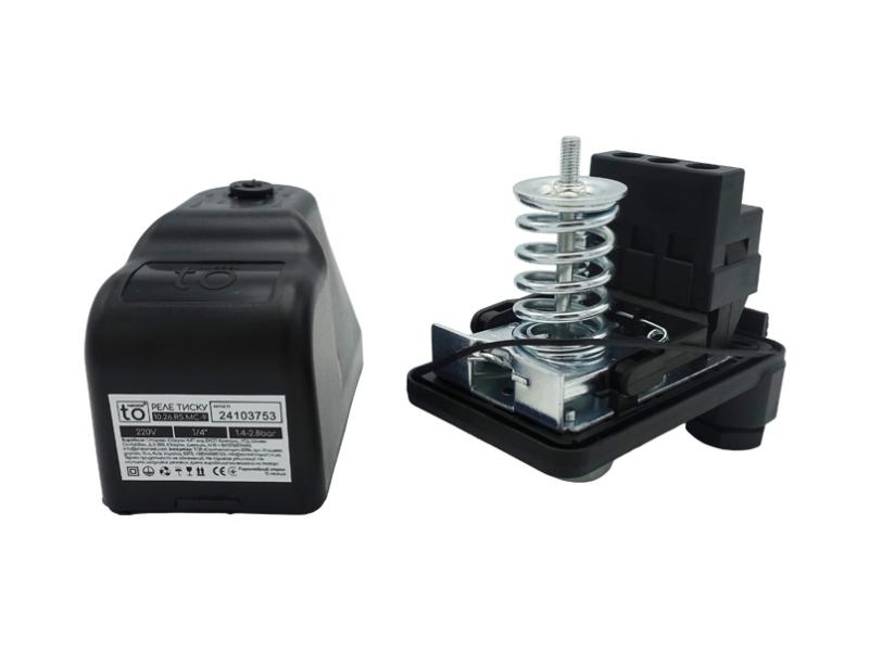 Реле тиску від бренду toНАСОСИ моделі 10.26.RS.MC-9 призначене для автоматизації роботи електронасоса, включаючи його при зниженні тиску (відкриття кранів) у системі водопостачання нижче встановленої межі, та відключаючи електронасос при досягненні верхньої встановленої межі (закриття кранів). Характеристики: Діапазон тиску: 1,4-2,8 бар Максимально допустимий тиск: 6 бар З'єднання реле: 1/4" Максимальний робочий струм: 16(10) А Напруга та частота мережі: 220 В, 50 Гц Максимальна температура довкілля: +55 °С
