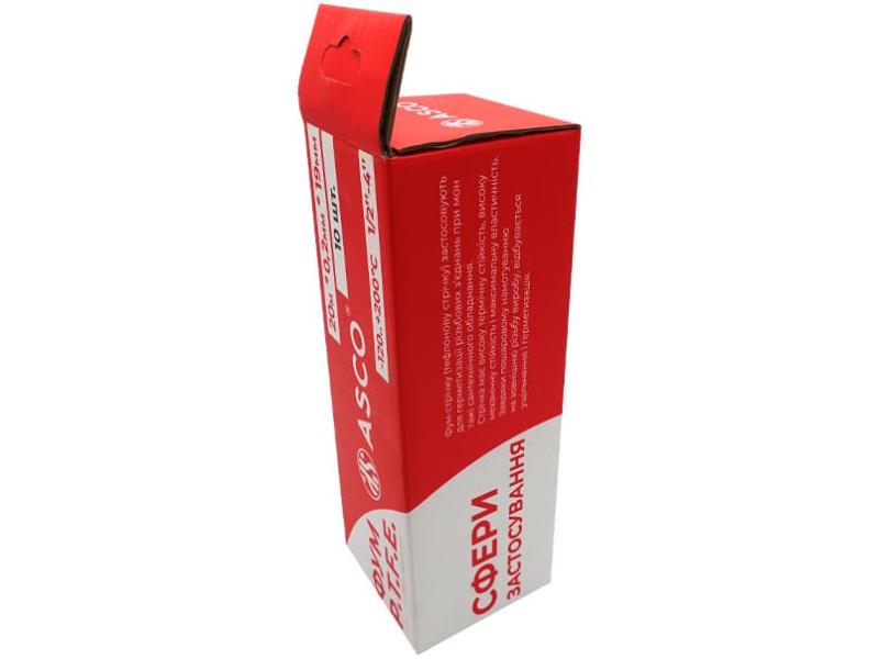 Фторопластова (ФУМ) стрічка ASCO 19 мм × 0.2 мм × 20 м (0.4 г/см3) або фторопластовий ущільнювач - це тонкий стрічковий синтетичний ущільнювач, що випускається у вигляді мотка із пластику. Сама стрічка біла, матова, в пластиковому тримачі червоного кольору. Завдяки вмісту фтору, фум стрічка має досить високу механічну і термічну стійкість. Вона не старіє, не рветься при розтягуванні і не втрачає своїх властивостей під впливом агресивного хімічного середовища або високої температури. Застосовується для ущільнення трубопроводів загальнопромислового типу або для систем, що працюють агресивними хімічними середовищами. Дана фум-стрічка продається складена по 10 шт. в картонне пакування.