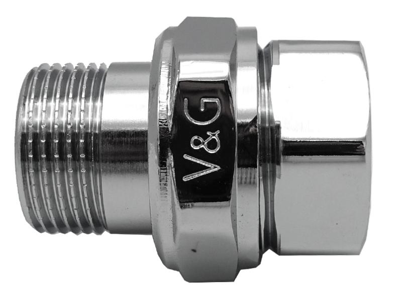Латунні різьбові фітинги V & G (нікельовані, хромовані) застосовуються для монтажу трубопровідних систем (водопровідних, господарсько-питних, опалювальних) для транспортування будь-яких середовищ, неагресивних до матеріалів виробу. ТЕХНІЧНІ ХАРАКТЕРИСТИКИ: тиск робочий 2,5 мПа (25 бар) (для розмірів від 1/2 "до 1", крім VG-204301, VG-204302); 1,6 мПа (16 бар) (для розмірів від 1 1/4 "до 2"). Робоча температура: від -20 до +200 ° С (для виробів без ущільнення), від -20 до +130 ° С (для виробів з ущільненням EPDM). Матеріал корпусу: латунь CW617N (ЛС 59-2).