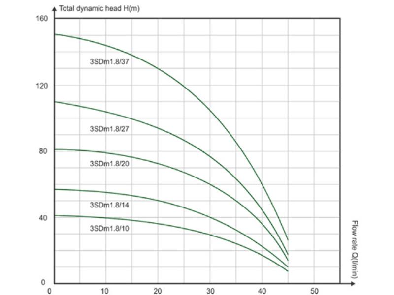 Свердловинний відцентровий насос FROG 3SDm1.8/27 2.8 м3/год.,110 м без кабеля потужністю 0,75 кВт. Стандартне підключення кабеля. Сфера застосування: • Подача води з колодязя або резервуара • Подача води для сільськогосподарських цілей • Промислове охолодження та переробка • Розподіл води та підвищення тиску тощо ТЕХНІЧНІ ДАНІ • Максимальна температура води: 35˚С • Максимально дозволений вміст піску: 1500 г/м3 • Маслонаповнений двигун з обмоткою • Максимальна глибина занурення: 120 м • Напруга / частота: 220-240 В / 50 Гц (оснащено контрольною автоматикою) • Клас ізоляції: В • Клас захисту: IP68 МАТЕРІАЛИ: Корпус насоса: нержавіюча сталь Вхідний отвір, випускний отвір Cast-Cu (лита мідь) Фільтр AISI 304SS Механічне ущільнення: Кераміка Дифузор: PC Верхня опора: Мідь/Сталь Робочі колеса: Поліацеталь Обмотка: мідь/ Випуск: 1'. Габарити самого насоса, мм: д1360 * ш70 * в70