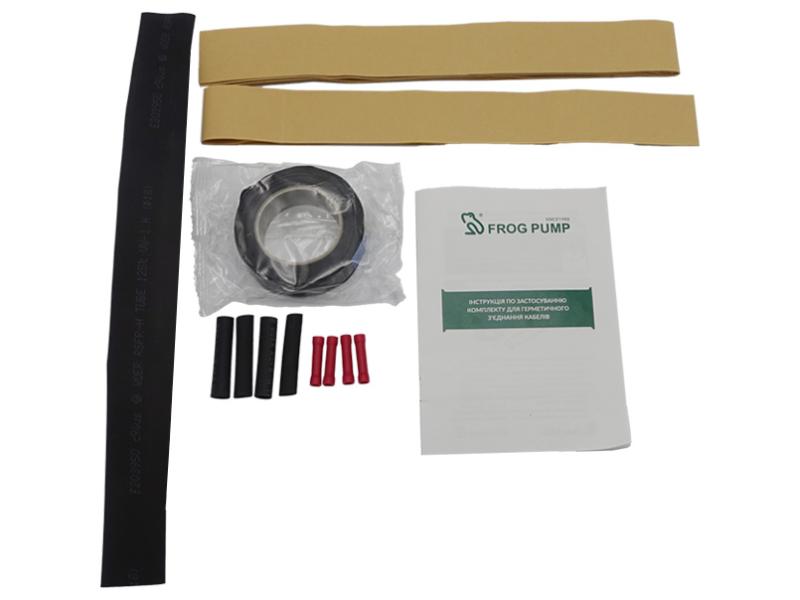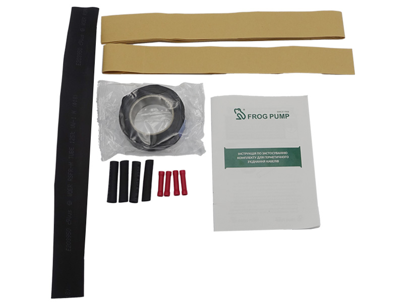 FROG набір термоусадковий для кабелів. Застосовується при подовженні кабелю насосів занурювального типу для надійної електричної ізоляції. Продається в поліетилені. В кожній упаковці - книжечка-інструкція. Дату виготовлення дивитись на упаковці. Зберігати в упаковці в сухому місці. Термін служби необмежений. Склад набору: наждачний папір, гГільзи під опресовування, трубки для фазної ізоляції