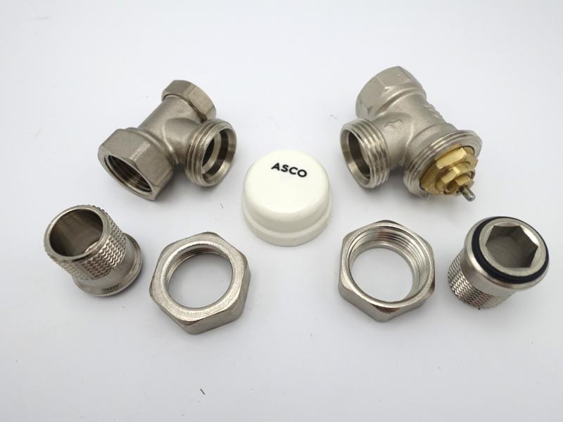 Комплект термостатичний кутовий ASCO 1/2". Комплект для підключення радіаторів торгової марки ASCO складається з двох радіаторних кранів і термоголови. Термостатична голова з різьбою M30 x 1,5 встановлюється на вентилі з гайкою так, щоб ручка регулювання температури була направлена на цифру "5". Далі фіксація затягується вручну. Увага! Не повинно бути жодного отвору відносно корпусу клапана. Щоб забезпечити правильну роботу, голова повинна монтуватися таким чином, щоб забезпечити вільний потік повітря навколо датчика, розташованого в головній ручці. Тому в жодному випадку не потрібно закривати термоголову завісою (фіранкою), оскільки це може призвести до неправильного вимірювання температури в приміщенні. Для регулювання кімнатної температури варто повернути регулятор, щоб встановити бажану температуру приміщення, наприклад, 20°C, що відповідає шкалі «3». Встановіть необхідну температуру в приміщенні. Якщо температура не досягає бажаного показника, встановіть значення на вищу цифру, наприклад, "4". Для регулювання потрібної температури коригуйте задану цифру кожні кілька годин. Термоголова має спеціальні фіксатори позиції які захищають голову від ненавмисного перемикання (дитиною, домашньою твариною). Набори для підключення радіаторів з термоголовою ASCO поставляються в картонній упаковці, комплектуються прямими або кутовими радіаторними кранами.