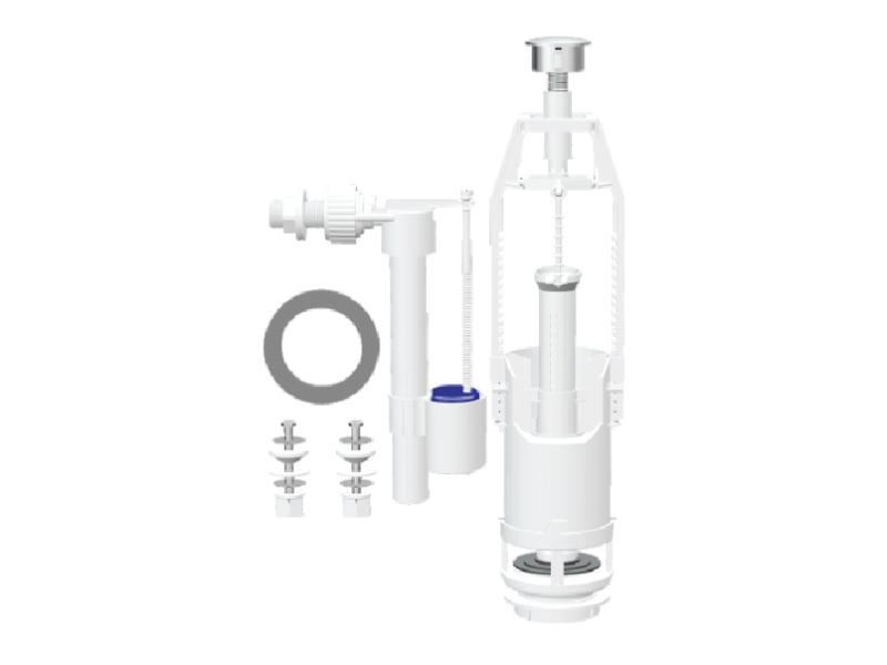 Набір для бачка унітазу MILLZ BK2R1110 складається зі зливного механізму з подвійним режимом зливу і хромованою кнопкою і наливного клапана з бічною підводкою пластиковим штуцером з різьбленням діаметром 1/2". Комплектується двома кільцями з еластичного спіненого ППУ, а також конусної і плоскою шайбами з еластичного високоякісного PVC, що забезпечують надійну герметизацію при установці клапана і механізму в бачку унітаза. Так само в комплект входить набір кріплення бачка до унітазу з гвинтами, гайками і шайбам з нержавіючої сталі. Область застосування для підключення унітазного бачка з боковим підведенням до мережі водопостачання для автоматичного наповнення унітазного бачка водою для зливу води з бачка унітазу для бачка унітазу із зливним отвором Ø60-70 мм Технічні характеристики приєднувальний розмір до мережі водопостачання G1/2" діапазон робочих тисків 0,05-1,0 Мпа час заповнення бачка в обсязі 6,0 л не більше 150 секунд стабільність рівня наповнення унітазного бачка водою не більше +/-2 мм рівень шуму при роботі не більше 50 дБА встановлений ресурс не менше 150000 циклів висота комплектного бачка з кришкою 330-400 мм діаметр приєднувального отвору в бачку унітаза 60-70 мм кількість режимів зливу - 2 обсяг зливаної води в першому (економному) режимі - 3 л середня витрата води, яка подається з бачка на змив через арматуру не менше 2,5 л/сек зусилля натискання кнопки для запуску зливу води не більше 20Н довжина нержавіючих гвинтів кріплення бачка до унітазу 82 мм Властивості комплектується ущільнювальними конусної і плоскою шайбами для герметизації з'єднання наливного клапана з бачком унітазу конусна і плоска шайби виготовлені з еластичного високоякісного PVC комплектується двома кільцями з еластичного спіненого ППУ, що забезпечують надійну герметизацію при установці зливного механізму в бачок унітаза, а так само при установці бачка унітазу на поличку унітаза штуцер різьбовий з високоякісного пластика в комплект входить набір кріплення бачка до унітазу гвинти, гайки і шайби для кріплення бачка до унітазу виготовлені з нержавіючої сталі кнопка і декоративне кільце кнопки пластмасові з хромованим покриттям робочий діапазон температур від 0 до + 95° C