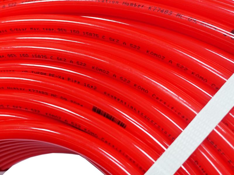 Tруба VG THERM PEX-A/EVOH для водяної теплої підлоги посиленої міцності. Кисневий бар'єр EVOH в складі труби надійно захистить вашу систему опалення від проникнення кисню методом дифузії. Труби із зшитого поліетилену PE-Xa мають унікальну здатність відновлювати первинну форму (так званий ефект "пам'яті форм") після деформацій, таких як перегини, надломи, цикл "заморозка-розморожування". Труби VG THERM PEX-A/EVOH мають підвищену м'якість поперечного згинання, що дозволяє з більшим комфортом робити укладання труб без використання додаткових фітингів для вигину. При виготовленні труб не використовуються токсичні елементи, такі як силан. Коефіцієнт теплопровідності 40 ВТ / m. Труби випускаються в червоному кольорі бухтами по 100, 200, 240, 300 і 600 метрів. Переваги: легкий монтаж, триступеневий контроль якості: розрив, на розтягнення і на цикли нагрівання / охолодження. Труби витримують температуру до 95 градусів. Робочий тиск 10 бар.