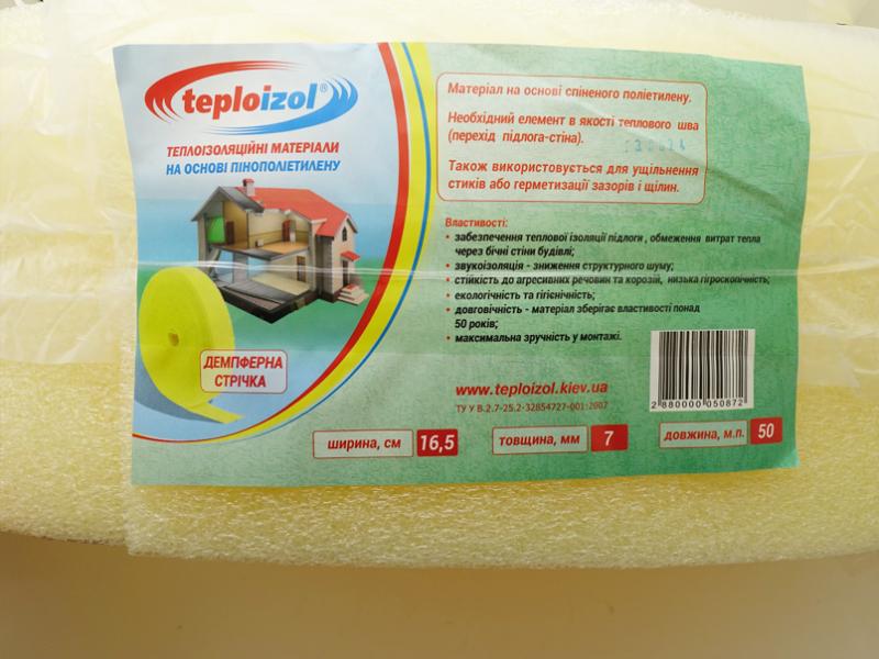 Демпферна стрічка UA 8 мм 50м. Вона виконує функцію компенсаційного елемента при розширенні стяжки теплої підлоги, запобігає несучі стіни від появи тріщин, знижує втрату тепла через примикаючі стіни. Вага 0,7 кг. Демпферна стрічка (арт. Р100) призначена для поглинання теплових розширень бетонної стяжки. Виготовляється зі спіненого поліетилену і прозорої нейлонової плівки, яка приклеюється гарячим способом. Запобігає розтріскування стяжки під час її висихання і подальшої експлуатації, одночасно виконує функції звукоізоляції і теплоізоляції приміщень, обмежуючи втрати тепла через стіни.