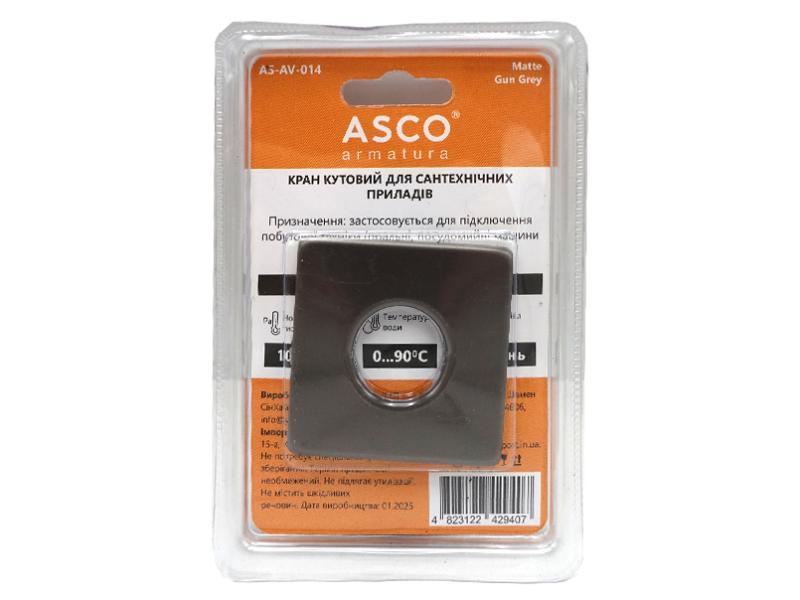 Кутовий кран ASCO використовують для підключення сантехнічних приладів, таких як пральні машини, до системи водопостачання за допомогою гнучких шлангів з накидною гайкою. Виготовлений із високоякісної латуні, яка не містить шкідливих речовин, та має матове покриття темно-сірого кольору. Це надає йому не тільки міцності, а й захищає від подряпин. Витримує тиск до 10 бар та температуру від 0°C до +90°C та розрахований мінімум на 3000 циклів. Кран дуже компактний (7х3,5 см) і має два виходи із зовнішньою різьбою (1/2"х3/4"). Монтується будь-яким зручним способом: вертикально та горизонтально. Гарантійний термін — 1 рік. Виробництво — Китай.