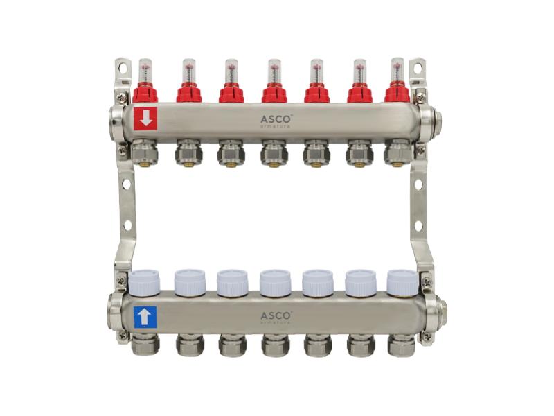Колекторна група ASCO armatura використовується в системах водопостачання та опалення. Вона забезпечує рівномірну підтримку тиску та надходження води для всіх приладів та контурів у системі водопостачання (крани, душ, пральна машина тощо) або опалення (тепла підлога). Виготовлена з нержавіючої сталі та має сім виходів з різьбою 1" для підключення металопластикових труб або РЕХ-труб Ø16 мм з товщиною стінок 2 мм. Для зручності контролю роботи оснащена вбудованими витратомірами. Колекторна група постачається у фірмовій картонній коробці зі штрихкодом. У комплект входить колекторна група з кріпленнями. Розмір коробки: 37,5 х 34 х 4,5 см. Виробництво: Китай.