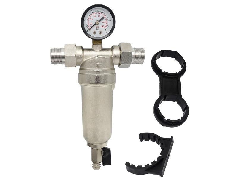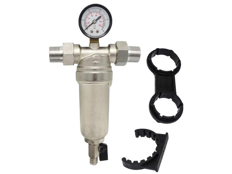 Самопромивний фільтр V&G встановлюють у системах центрального водопостачання для механічного очищення води від домішок: піску, іржі, опадів. Це захищає від поламання підключені прилади (бойлери, пральні та посудомийні машини). Корпус фільтра виготовлений з нікельованої латуні та оснащений різьбовими виходами 1/2" ЗЗ. Вода магістрально проходить через фільтрувальний картридж, опади збираються в латунному стаканчику. Для промивання достатньо відкрити спусковий кран. Додатково фільтр обладнаний манометром для контролю тиску води. Фільтр встановлюється горизонтально, при цьому спусковий кран повинен знаходитися у вертикальному положенні (вниз). Постачається у фірмовій картонній упаковці зі штрихкодом. Розмір коробки: 28,5 × 19,5 × 8,2 см. Виробництво: Китай.