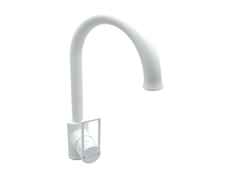 Змішувач для мийки AIM поєднує класичний дизайн та практичний функціонал. Виготовлений із латуні та має матове біле покриття, яке не піддається волозі та подряпинам. Литий корпус висотою 7,8 см і оснащений ущільнювальною прокладкою для запобігання протіканню. Високий (26 см) напівкруглий гусак легко повертається, що дозволяє спрямовувати струмінь у будь-яку частину мийки та зручно мити великогабаритний посуд. Розширений носик виливу має аератор, який запобігає розбризкуванню води. Бічний важіль з керамічним картриджем забезпечує плавно та точно регулює напір та температури струменя. Ручка зі зручним прорізом для захоплення та кольоровими маркерами подачі води. Кріплення здійснюється за допомогою притискної гайки. Змішувач не вимагає особливого догляду, його достатньо періодично протирати вологою ганчірочкою. Постачається у фірмовій картонній коробці зі штрихкодом. В комплект входять: змішувач з прокладкою, 2 підвідні шланги, гайка з прокладками, інструкція, гарантійний талон, трикотажні рукавички. Розмір упаковки 390х260х78 мм. Гарантія: 5 років. Виробництво: Китай.