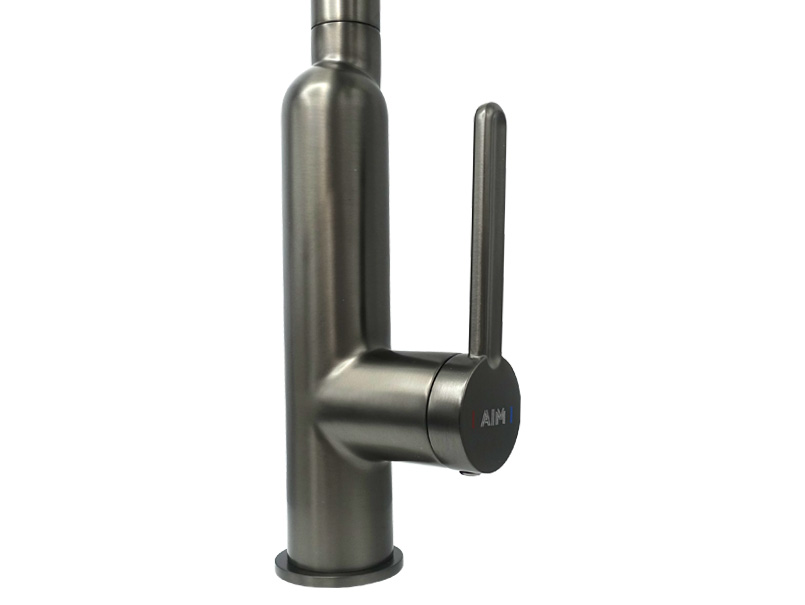 Змішувач з витяжною лійкою AIM — зручне та функціональне рішення для острівних мийок. Виготовлений із міцної латуні та має матове темно-сіре покриття, яке захищає від корозії та подряпин. Литий корпус висотою 20 см оснащений бічним важелем-прапорцем з керамічним картриджем для плавного регулювання напору та температури води. Напівкруглий литий гусак висотою 30 см легко повертається, що робить миття більш комфортним. Витяжна лійка (9 см) дозволяє не тільки вимити великогабаритний посуд, а й за необхідності набрати в нього воду. У розширений вилив вбудований аератор із двома видами форсунок, що формує два режими води, струменевий та дощовий. Перемикання між ними здійснюються кнопкою, розташованою на лійці. Змішувач кріпиться на борт за допомогою гайки та не потребує особливого догляду. Постачається у фірмовій міцній картонній коробці (710х273х91 мм) зі штрихкодом. В комплект входять: змішувач з кріпленнями 2 підвідних шланга, вантаж для лійки, інструкція, талон, трикотажні рукавички. Гарантія: 5 років. Виробництво: Китай.