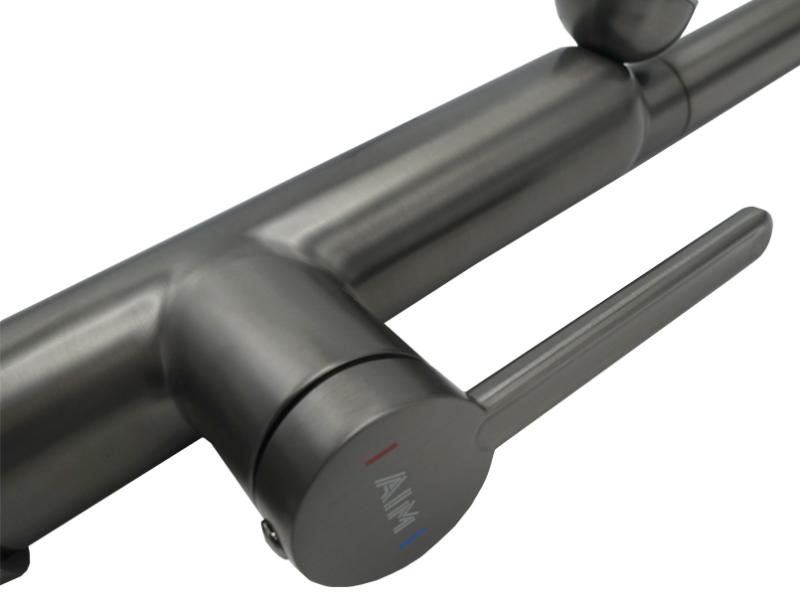 Змішувач з витяжною лійкою та термостатом AIM ідеально підходить для острівних мийок та забезпечує комфортне використання з усіх боків. Виготовлений із міцної латуні та має матове темно-сіре покриття, яке надійно захищає від корозії. Стійкий литий корпус висотою 20 см оснащений термостатом та бічним важелем-прапорцем з керамічним картриджем. Термостат дозволяє встановити необхідну температуру води, а бічний важіль-прапорець регулює її напір. Напівкруглий литий гусак висотою 30 см легко повертається в будь-який бік, що полегшує миття великогабаритного посуду. Витяжна лійка довжиною 9 см дозволяє спрямувати струмінь воду під будь-яким кутом. У розширений носик вбудований аератор з різними форсунками, що формує два режими, струменевий та дощовий. Перемикання на них здійснюється за допомогою кнопки, що знаходиться на лійці. Змішувач забезпечує максимальний комфорт при використанні та не потребує особливого догляду. Встановлюється на борт мийки за допомогою гайки. Постачається у фірмовій міцній картонній коробці (710х273х91мм) зі штрихкодом. В комплект входять: змішувач з кріпленнями 2 підвідних шланга, вантаж для лійки, інструкція, талон, трикотажні рукавички. Гарантія: 5 років. Виробництво: Китай.