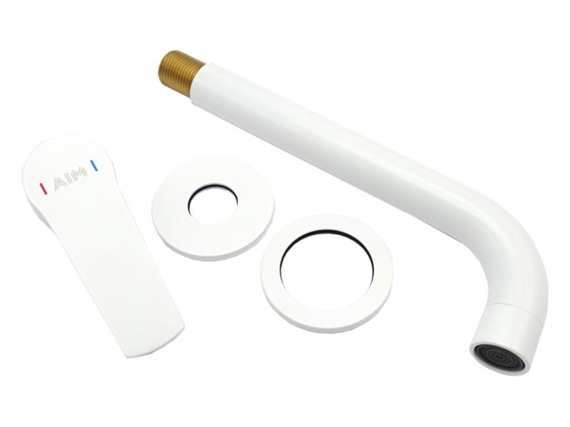 Комплект для раковини прихованого монтажу AIM поєднує сучасний дизайн і функціональність. Виготовлений із міцної латуні та має матове біле покриття, яке захищає від корозії та подряпин. Змішувач із керамічним картриджем монтується у стіну. Зовні залишаються лише елементи управління: важіль-прапорець для регулювання напору та температури води, а також вилив. Управління потоком води здійснюється за допомогою важеля довжиною 11 см, для цього достатньо відвести його убік. Довгий гусак (20 см) з плавно закругленим носиком направляє струмінь точно в центр раковини та не допускає розбризкування. Змішувач прихованого монтажу дозволяє заощадити місце на раковині й не потребує особливого догляду. Постачається у фірмовій картонній коробці (250х280х150 мм) зі штрихкодом. В комплект входять: змішувач, важіль, гусак, 2 декоративні чаші, кріплення, рукавички трикотажні, інструкція, гарантійний талон. Гарантія: 5 років. Виробництво: Китай.