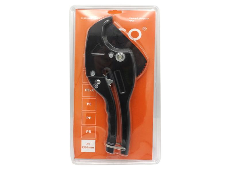 Ножиці призначені для ручного розрізання під прямим кутом металополімерних та пластикових труб із зовнішнім діаметром до 63 мм включно. Під час різання гнучкої труби з ПВХ слід обертати трубу під час стискання. Перевірка: До початку роботи різаком необхідно переконатися, що ніж заходить точно по центру паза верхніх губок. Перекіс свідчить або про слабку затяжку болтів або про слабку затяжку гвинта осі. Усі болти слід підтягнути. ВАЖЛИВО! Після роботи з трубами необхідно очистити лезо мастилом. Без цього лезо може прийти в несправність. Після 300 циклів порізу необхідне заточування лез. УВАГА! Коли цей продукт використовується взимку, трубу спочатку поміщають у теплу воду для нагрівання для кращого різання. Не використовувати для перерізу електрокабелів.
